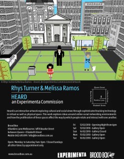Heard is an interactive artwork exploring cultural and social views through sophisticated tracking technology in virtual as well as physical space. The work explores ideas around online social networking environments and how the proliferation of these spaces effect the way by which people relate and interact with one another.