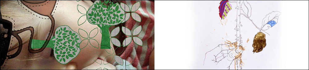 Lucy HG Solomon (below left) presents an animated, microcosmic view of ecosystems, where human experiences are embedded in nature, and visa versa. Christine Morla (below right) renders plants in micro/macro and imaginative ways, with a human touch.
